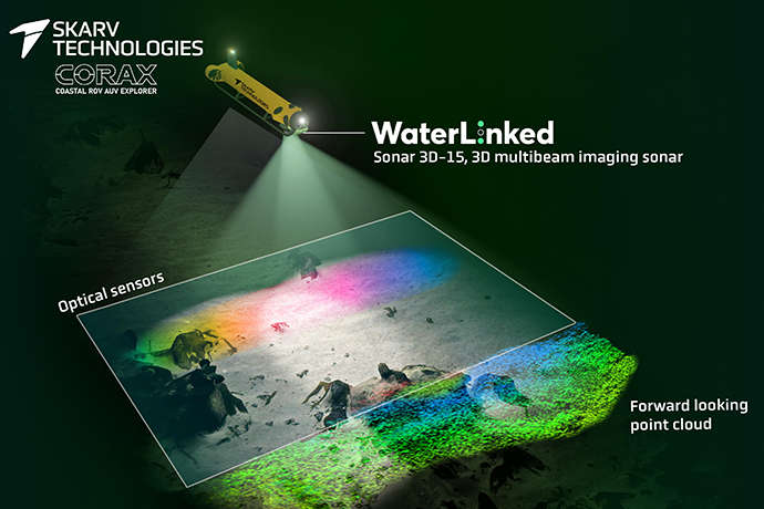 The new Skarv AUV, CoraxThe new Skarv AUV is built to address common challenges in underwater navigation, offering a modular and versatile design. This adaptability means the AUV can accommodate a range of sensors, allowing for tailored mission objectives. With the help of the Sonar 3D-15, the AUV can excel at close-range inspections and seafloor mapping, utilizing both optical and acoustic data for a comprehensive view of underwater environments.